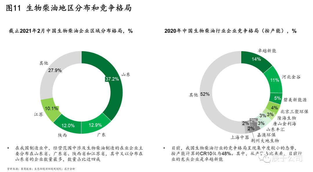 在銷售應(yīng)用上,國內(nèi)的主要渠道是出口、交通燃料、化工等,出口是拉動(dòng)行業(yè)發(fā)展的主要渠道,2019年出口占產(chǎn)量的比例達(dá)到80%。國內(nèi)需求的打開是行業(yè)發(fā)展的最大希冀,其中最有望打開的市場(chǎng)是交通燃料領(lǐng)域——生物柴油強(qiáng)制添加政策。部分城市已經(jīng)開始在試點(diǎn),上海市2013年開始在公交車上實(shí)行B5標(biāo)準(zhǔn)(添加比例5%)。現(xiàn)在國家已開始全國范圍進(jìn)行B5 強(qiáng)制添加標(biāo)準(zhǔn)的意見征求,并有望隨著雙碳目標(biāo)深入推進(jìn)提升到B10。若政策落地實(shí)施,將產(chǎn)生450萬噸~1000萬噸的產(chǎn)能缺口。
