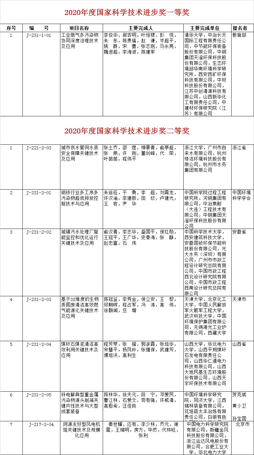 環(huán)境商會(huì)匯總整理了生態(tài)環(huán)境領(lǐng)域獲獎(jiǎng)名單,共有11個(gè)項(xiàng)目榮獲2020年國(guó)家科技獎(jiǎng),其中,王愛(ài)杰、彭永臻、中國(guó)科學(xué)院生態(tài)環(huán)境研究中心程浩毅、梁斌、中持股份邵凱、信開(kāi)水環(huán)境侯鋒等共同完成的“污水深度生物脫氮技術(shù)及應(yīng)用”項(xiàng)目榮獲國(guó)家技術(shù)發(fā)明獎(jiǎng)二等獎(jiǎng),李俊華,郝吉明、中節(jié)能環(huán)保裝備等聯(lián)合完成的“工業(yè)煙氣多污染物協(xié)同深度治理技術(shù)及應(yīng)用”項(xiàng)目榮獲國(guó)家科技進(jìn)步獎(jiǎng)一等獎(jiǎng);俞漢青、中節(jié)能國(guó)禎、光大水務(wù)等聯(lián)合完成的“城鎮(zhèn)污水處理廠智能監(jiān)控和優(yōu)化運(yùn)行關(guān)鍵技術(shù)及應(yīng)用”;新疆金風(fēng)科技等申報(bào)的“網(wǎng)源友好型風(fēng)電機(jī)組關(guān)鍵技術(shù)及規(guī)模化應(yīng)用”等項(xiàng)目榮獲國(guó)家科技進(jìn)步二等獎(jiǎng)。
