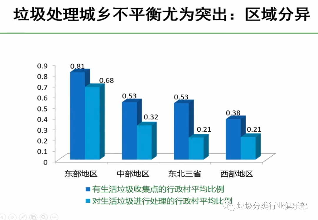 垃圾處理方面,區(qū)域差異性比較大。經(jīng)濟(jì)比較發(fā)達(dá)的東部地區(qū)、其次是中部略微要好些。東部很多地方都已經(jīng)通過城鄉(xiāng)一體化的管理以及垃圾的處理,基本上有了一些保障,但是東北、西部依然看到有生活垃圾收集點的行政村比例都很低,處理的就更低了。