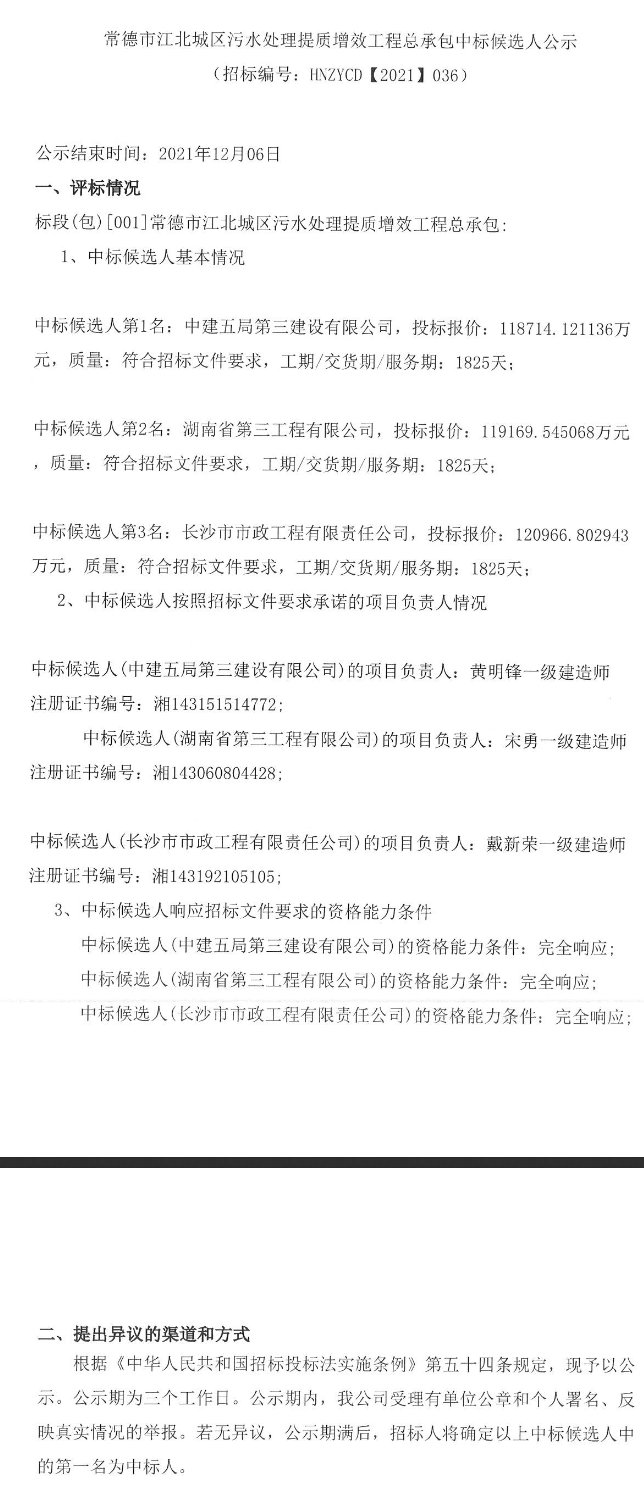原標(biāo)題:常德市江北城區(qū)污水處理提質(zhì)增效工程總承包中標(biāo)候選人公示