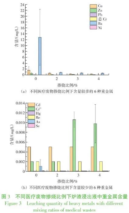 圖3(a)表示了不同比例摻雜醫(yī)療廢物爐渣含量較多的重金屬浸出情況,可見醫(yī)療廢物的摻入對Cu和Ba的浸出影響較為明顯,隨著醫(yī)療廢物摻入比例的增加,Cu的浸出量明顯降低,從1.6 mg/L降低到0.33 mg/L。Ba浸出量降低的趨勢更加明顯,從12.82 mg/L降低到0.64~0.89 mg/L,這是由于生活垃圾成分復(fù)雜,分類不夠徹底時,部分灰土、玻璃、磚瓦陶瓷、金屬類垃圾等成分會嚴重影響爐渣中的Ba元素含量,但是醫(yī)療廢物中并不存在這些組分,因此Ba的浸出濃度降低明顯。摻燒醫(yī)療廢物后爐渣中Zn的含量與原爐渣比也有所降低,但不同醫(yī)廢摻燒比例下的Zn含量變化不大,在0.1~0.2 mg/L范圍波動。Long等研究了中國城市垃圾中重金屬的分布,指出廚余、灰渣、塑料以及紙張占垃圾總量的55.1%~99.5%,并且這幾種垃圾組分中的Cu及Zn含量分別占垃圾總量的 76.3%和 82.3%。醫(yī)療廢物這些組分相對較少,所以Cu和Zn的含量略有降低。摻入醫(yī)療廢物混燒后,其他重金屬浸出濃度相對較少,并無明顯變化。爐渣中含量較多的重金屬,含量高低依次為:Ba>Zn>Cu。但是其浸出濃度遠遠低于GB 5085.3—2007危險廢物鑒別標(biāo)準(zhǔn) 浸出毒性鑒別的限值。