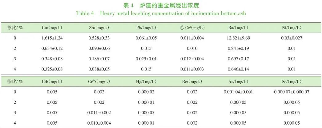 如表3所示,日常焚燒生活垃圾爐渣平均熱灼減率為2.56%,而摻燒醫(yī)療廢物的爐渣范圍是2.18%~2.43%,較原爐渣略有下降,這是因為醫(yī)療廢物熱值較高,可促進爐渣中的碳燃盡。