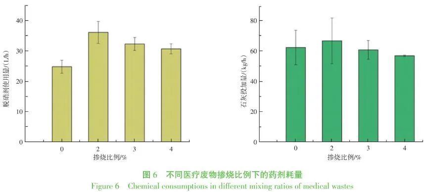 由圖4可以看出,生活垃圾日常運行熱處理焚燒煙氣中CO本身含量較低,平均為1.72 mg/m3,遠低于排放標(biāo)準(zhǔn)的限值。摻燒醫(yī)療廢物后煙氣中CO含量顯著升高,當(dāng)摻燒比例為3%時,CO平均含量達13.78 mg/m3,是日常運行工況下的8倍,但是仍然遠低于標(biāo)準(zhǔn)值,其上偏差雖然有7.33 mg/m3,但是仍低于排放限值。2%和4%的摻燒比例下,煙氣中CO的含量增加,分別是日常運行條件下的3.8倍和2.2倍,但是明顯低于摻燒比例為3%的工況。顯著性分析發(fā)現(xiàn)P<0.05,說明摻燒醫(yī)療廢物對焚燒煙氣中CO含量有明顯影響,且呈現(xiàn)增加的趨勢。這是因為醫(yī)療廢物的熱值偏高,即使在供風(fēng)相應(yīng)地調(diào)整前提下,可能會因為局部熱負荷高、在高溫區(qū)停留時間縮短而引起CO升高。 醫(yī)療廢物的Cl典型含量為1.1%~2.1%,而生活垃圾在0.2%~0.8%的水平。但是表2中數(shù)據(jù)顯示醫(yī)療廢物的Cl含量雖然偏高,但是未達到上述水平,這可能與醫(yī)療廢物的來源及取樣有關(guān)。由圖5可以看出,日常運行焚燒煙氣中HCl平均含量為3.32 mg/m3,在生活垃圾中摻燒醫(yī)療廢物后煙氣中HCl含量略有降低,這可能是因為進料波動引起的。在2%摻燒比例下煙氣中HCl含量變化不大,僅為3.30 mg/m3,基本與日常運行條件下的含量持平,但是石灰投加量有所增加,如圖6所示。摻燒比例為3%和4%時,HCl濃度反而降低明顯,對應(yīng)地石灰的消耗量也有所降低,這可能與生活垃圾的組分波動有關(guān),因為摻燒試驗時間長達8 d,生活垃圾組分和醫(yī)療廢物組分均可能出現(xiàn)變化,也說明垃圾組分本身的波動可能掩蓋小比例的醫(yī)療廢物摻燒的影響。