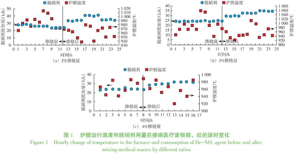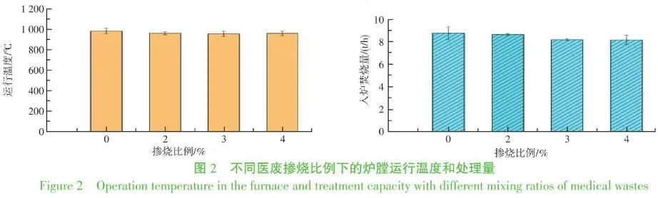 這里主要關(guān)注醫(yī)療廢物摻燒對焚燒爐爐膛溫度和焚燒處理量的影響。圖1給出每個摻燒比例前后的爐膛溫度和脫硝劑用量的逐時變化。其中摻燒比例為2%和3%(wt)時,前12 h為日常運行情況,后12 h為摻燒后的代表性工況;摻燒比例為4%(wt)時,前8 h為日常運行情況,后8 h為摻燒后的代表性工況。將上述逐時溫度按照不同醫(yī)療廢物添加量工況取平均值,結(jié)果見圖2,圖2同時給出了實際的入爐垃圾焚燒量??梢姡粘_\行爐膛內(nèi)溫度較高,平均可達982.72 ℃,在摻燒醫(yī)療廢物后爐膛溫度略有降低,這可能是由于供風(fēng)量隨著醫(yī)療廢物摻燒比例的增加而增大引起的變化,但是不同摻燒比例下運行溫度變化不大,無顯著性差異,總體上運行溫度在正常波動范圍內(nèi),并高于850 ℃。