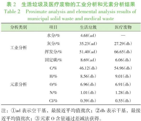 生活垃圾的采樣均按照CJ/T 313—2009生活垃圾采樣和分析方法進行,取樣點在垃圾池。醫(yī)療廢物主要來自社康醫(yī)院垃圾池中一固定區(qū)域,在與生活垃圾混合前取樣,因試驗在新冠疫情期間進行,為安全起見,所取的醫(yī)療廢物樣品先稱質(zhì)量后,再通過高壓蒸汽滅菌,然后再進行分析。表1和表2給出了試驗期間某次取樣得到的醫(yī)療廢物和生活垃圾的組成與性質(zhì)。