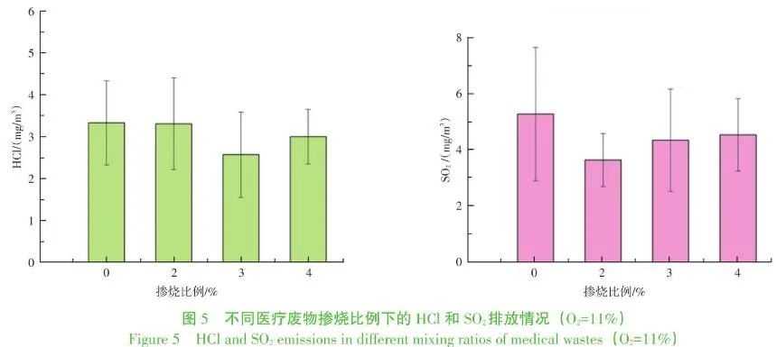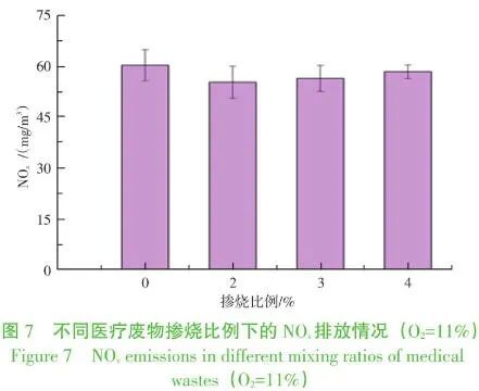 圖7顯示日常運行焚燒煙氣中NOx排放量為60.18 mg/m3,完全滿足排放標(biāo)準(zhǔn)。在摻燒醫(yī)療廢物后NOx的含量總體上有微幅降低。其中2%摻燒比例降低明顯,為55.18 mg/m3,降低了8.3%,這主要因為此時系統(tǒng)的脫硝劑用量最大,見圖6。顯著性分析顯示,醫(yī)療廢物的摻燒對NOx排放影響不大,數(shù)據(jù)無顯著性差異,這是因為NOx的濃度與脫硝藥劑消耗量及溫度有對應(yīng)關(guān)系,一方面圖2顯示摻燒后爐膛溫度有微弱下降,另一方面圖6顯示煙氣脫硝劑的消耗量有所增加,最終使得NOx排放水平基本穩(wěn)定。