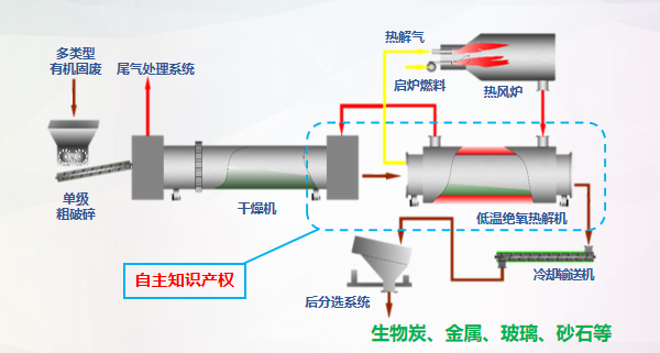 低溫絕氧熱解碳化技術(shù)是個(gè)負(fù)碳過程,也是碳中和、碳達(dá)峰的重要手段之一。其具有兩大特點(diǎn):一是,技術(shù)包容性強(qiáng),污泥、餐廚垃圾等多種類有機(jī)固廢協(xié)同處理;二是,100%資源化,熱解氣回歸系統(tǒng)再利用,終產(chǎn)物只有生物炭、金屬、玻璃、砂石。