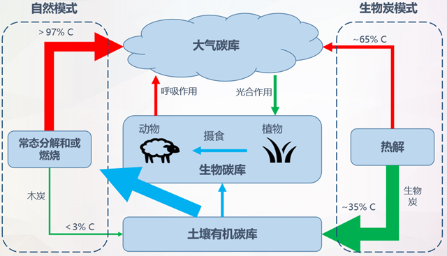 工業(yè)化時(shí)代之前,碳排放是一個(gè)完全自然平衡的狀態(tài);但工業(yè)化之后,人類大量從土壤中獲取化石能源進(jìn)行碳排放,徹底打破了這個(gè)平衡。自然環(huán)境下幾百年、上千年才能留下的沉積碳,現(xiàn)在通過生物炭模式就能在短短一兩個(gè)小時(shí)在工業(yè)環(huán)節(jié)中就能把原生垃圾和其他有機(jī)固廢處理成生物碳并還碳入土,其各環(huán)節(jié)的碳比例如下圖所示: