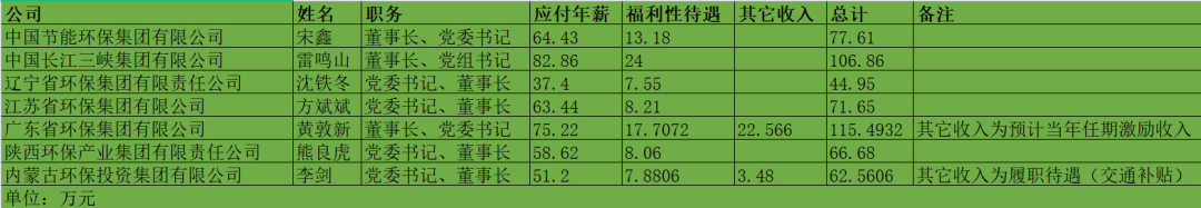 單看行業(yè)平均水平,大家感覺似乎有點(diǎn)悲觀,好像環(huán)保行業(yè)沒啥前途。不過,如果從高管薪酬水平來看,其實(shí)環(huán)保行業(yè)還是有不少收入較高的職位的。近日,國務(wù)院國資委和各地方國資委就公布了所屬企業(yè)負(fù)責(zé)人的薪酬情況,本文就給大家盤一盤環(huán)保行業(yè)高管的薪酬情況,看一看“國家隊(duì)”、地方環(huán)保集團(tuán),以及民企上市公司誰的薪酬水平更高?2021年的最后一天,國務(wù)院國資委發(fā)布《2020年度中央企業(yè)負(fù)責(zé)人薪酬披露》,公布了96家中央企業(yè)負(fù)責(zé)人的薪酬水平。其中,與環(huán)保行業(yè)有關(guān)的主要是兩家企業(yè),一家是中國節(jié)能環(huán)保集團(tuán)有限公司(下稱“中節(jié)能”),另一家是中國長江三峽集團(tuán)有限公司(下稱“三峽集團(tuán)”)。兩家企業(yè),都是國家實(shí)施“長江大保護(hù)”戰(zhàn)略的平臺型公司,作用都非常重要。兩家企業(yè)中,三峽集團(tuán)負(fù)責(zé)人的薪酬水平略高,董事長、黨組書記雷鳴山的應(yīng)付年薪和福利性待遇(主要指社會保險(xiǎn)、企業(yè)年金、補(bǔ)充醫(yī)療保險(xiǎn)及住房公積金)總計(jì)達(dá)到106.86萬元,而中節(jié)能董事長、黨委書記宋鑫則為77.61萬元。看完“國家隊(duì)”的,再來看看地方環(huán)保集團(tuán)的。在國務(wù)院國資委公布央企負(fù)責(zé)人薪酬水平的同時,各地方國資委也公布了2020年度省屬企業(yè)負(fù)責(zé)人的薪酬信息,北極星環(huán)保網(wǎng)專門整理了5家地方環(huán)保集團(tuán)企業(yè)負(fù)責(zé)人的薪酬情況。這5家地方環(huán)保集團(tuán)分別是:遼寧省環(huán)保集團(tuán)有限責(zé)任公司、江蘇省環(huán)保集團(tuán)有限公司、廣東省環(huán)保集團(tuán)有限公司、陜西環(huán)保產(chǎn)業(yè)集團(tuán)有限責(zé)任公司和內(nèi)蒙古環(huán)保投資集團(tuán)有限公司。5家企業(yè)中,企業(yè)負(fù)責(zé)人薪酬最高的是廣東省環(huán)保集團(tuán)有限公司,其董事長、黨委書記黃敦新應(yīng)付年薪為75.22萬元,福利性待遇17.7072萬元,另外還有22.5660萬元的預(yù)計(jì)當(dāng)年任期激勵收入,合計(jì)一共是115.4932萬元。薪酬最低的,是遼寧省環(huán)保集團(tuán)有限責(zé)任公司,黨委書記、董事長沈鐵冬應(yīng)付年薪37.40萬元,福利性待遇7.55萬元,總計(jì)44.95萬元。其余3家企業(yè),負(fù)責(zé)人薪酬水平都差不太多,基本在60萬元-70萬元之間。全部看下來,可以看出,無論是“國家隊(duì)”還是地方環(huán)保集團(tuán),企業(yè)負(fù)責(zé)人的薪酬水平都不能算太高,超過100萬元的已屬于鳳毛麟角,大部分都在60萬元-70萬元左右。相對來說,南方企業(yè)總體來講比北方企業(yè)的薪酬水平要高一點(diǎn)。例如廣東、江蘇的地方環(huán)保集團(tuán),企業(yè)負(fù)責(zé)人薪酬就要比陜西、內(nèi)蒙古高,而遼寧在已公布的幾個省份中則是最低。▼2家環(huán)保央企和5家地方環(huán)保集團(tuán)企業(yè)負(fù)責(zé)人薪酬信息。制圖:環(huán)保圈看完環(huán)保行業(yè)央企和地方國資的高管薪酬情況,再來看看民企的。這方面,主要信息來源是各大環(huán)保上市公司的2020年的年報(bào)。具體的數(shù)據(jù),《環(huán)保圈》去年曾經(jīng)總結(jié)過,這里直接說結(jié)論。首先,我們統(tǒng)計(jì)了217位上市環(huán)保企業(yè)高管的薪酬水平,平均值是每人97萬元/年,接近“百萬元”吧。其次,雖然平均值達(dá)到了“百萬元”,但具體來看,每個人的情況差別還是很大的。最高的可以拿到625萬元,最低的則只有2.4萬元,足足相差了260倍。年薪最高的,是盈峰環(huán)境副總裁陳培亮,2020年年薪高達(dá)625萬元,可謂是環(huán)保領(lǐng)域的“最強(qiáng)打工人”。排名第二、第三的也是民企,他們分別是格林美的兩位高管——55歲的董事長許開華(587萬元/年)和62歲的常務(wù)副總王敏(312萬元/年)。此外,年薪在150萬元以上的還有:中持股份副總經(jīng)理張翼飛、東江環(huán)保董事長譚侃、節(jié)能國禎創(chuàng)始人李煒、東方園林董事長劉偉杰、博天環(huán)境董事長趙笠鈞、瀚藍(lán)環(huán)境總經(jīng)理金鐸、清新環(huán)境總裁李其林、維爾利董事長李月中等。可以看出,這些企業(yè)絕大多數(shù)都是民企(2020年時中持、國禎、博天等尚未完成“混改”)。▼年薪過200萬的13位上市環(huán)保企業(yè)高管2020年年薪最低的董事長是富春環(huán)保董事長萬嬌,只有2.5萬元,月平均工資約2000元。大家知道,富春環(huán)保是一家剛剛經(jīng)歷了“混改”的企業(yè),2020年南昌市國資委剛剛?cè)胫鳎f嬌則是由南昌國資提名,代替原董事長的人選。當(dāng)然,民企高管的薪酬水平也并不一定都很高,也有偏少的。比如中國天楹,除總裁曹徳標(biāo)年薪36萬元外,其余副總裁一律年薪25萬元,月工資2.1萬。▼中國天楹高管團(tuán)隊(duì)收入(數(shù)據(jù)/東方財(cái)富網(wǎng))總體來看,排名靠前、薪酬較高的企業(yè),絕大多數(shù)都是業(yè)績表現(xiàn)好,坐落于北上廣深的大型環(huán)保上市企業(yè),如盈峰環(huán)境、格林美、中持股份、首創(chuàng)股份、綠色動力、清新環(huán)境等。總體來看,“國家隊(duì)”、地方環(huán)保集團(tuán)企業(yè)負(fù)責(zé)人