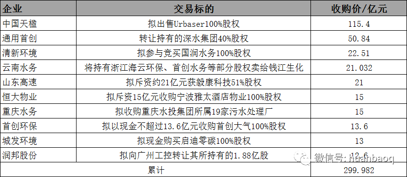 這里想強調(diào)一點,不得已“賣賣賣”的,不僅是業(yè)內(nèi)熟知的資金出現(xiàn)問題的環(huán)保民企,還有一批之前跨界進軍環(huán)保的傳統(tǒng)行業(yè)企業(yè),比如去年并購案的馬鞍山鋼鐵股份,子公司合肥板材就向?qū)毼渌畡?wù)轉(zhuǎn)讓了合肥供水100%股權(quán),他們賣資產(chǎn)的目的是為了做強做精鋼鐵主業(yè),有序退出非主業(yè)環(huán)保資產(chǎn)。