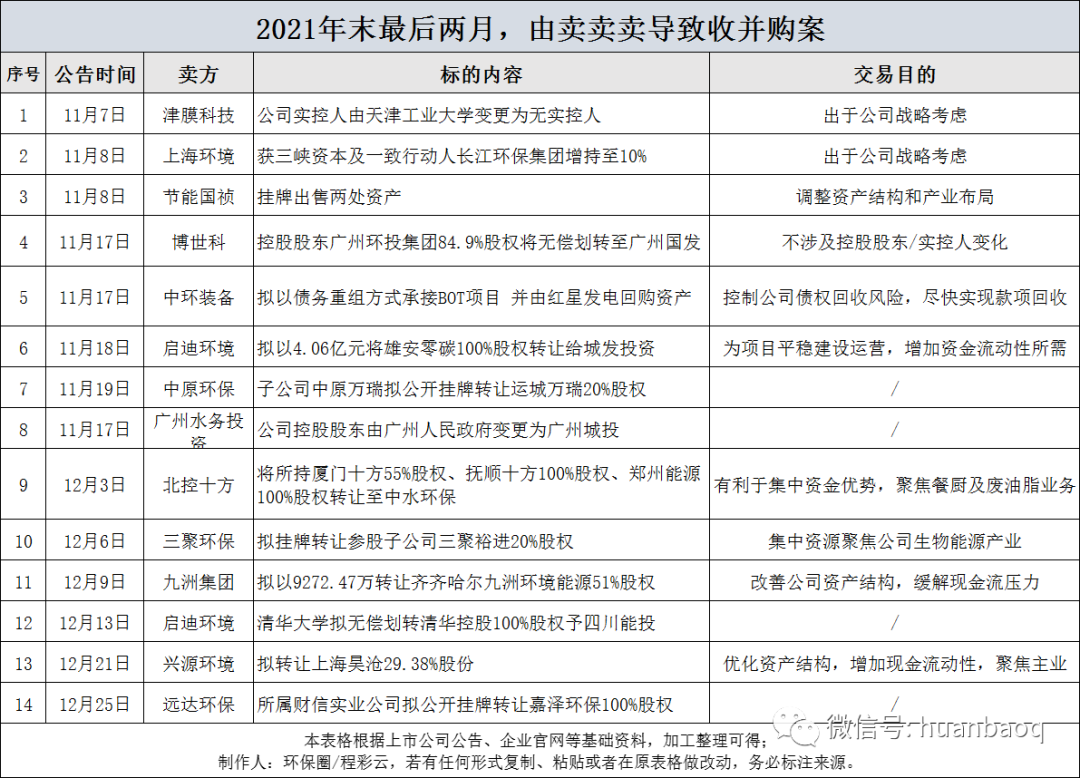 但更多的是,不少我們熟知的上市環(huán)企為了降低負債、保存實力“過冬”、緩解資金流動壓力,開始“賣賣賣”,小至某個污水處理廠、垃圾焚燒廠股權(quán)出售,大至整個公司實控人發(fā)生變更,年末最后兩月累計發(fā)生的26起并購交易案,其中“賣賣賣”占據(jù)一半,高達14起。
