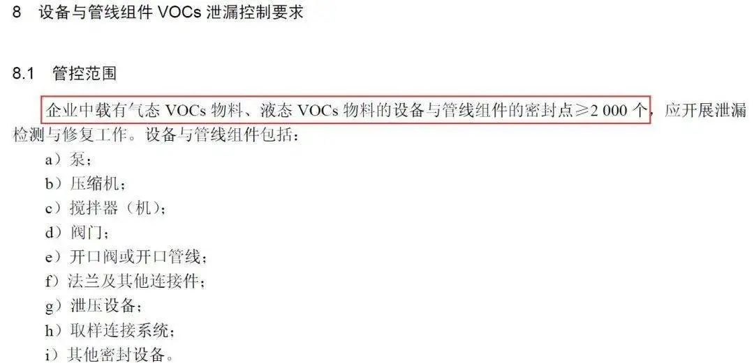 即對(duì)于企業(yè)中載有氣態(tài)VOCs物料、液態(tài)VOCs物料的設(shè)備與管線組件密封點(diǎn)小于2000個(gè)的,不強(qiáng)制開展泄露檢測(cè)與修復(fù)工作。