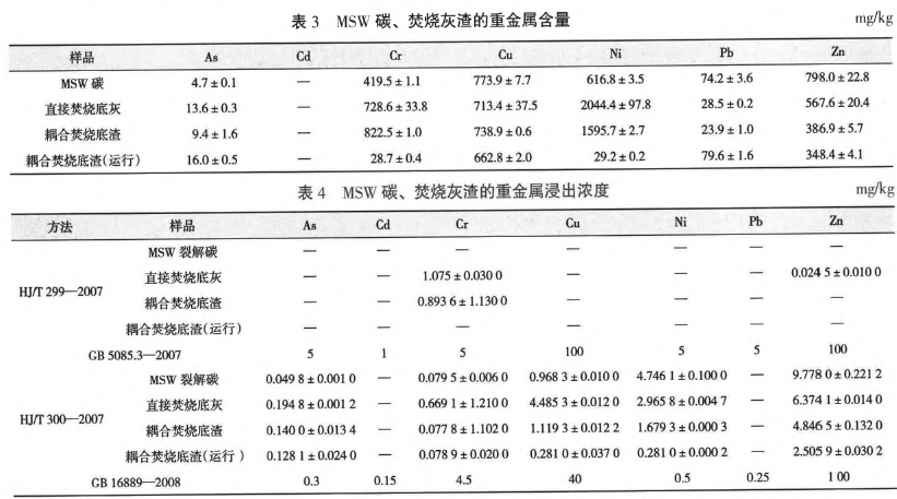 表3顯示:直接焚燒底灰中的As、Ni、Cu和zn的含量較高,而耦合焚燒底渣中Cr、Nj的含量也較高。HJ/T 299--2007浸出試驗(yàn)方法采用了酸化的去離子水作為浸出液,固液比為10,由標(biāo)準(zhǔn)GB 5085.3—2007來判斷飛灰是否為危險(xiǎn)廢物HJ/T 300---2007的試驗(yàn)方法采用了醋酸作為提取液,固液比為20,由標(biāo)準(zhǔn)GB 16889—2008來判斷廢物是否適合衛(wèi)生填埋。表4中的數(shù)據(jù)表明,底灰和爐渣均適合填埋,雖玻璃化底渣保留了大部分重金屬,但因其低滲出性,仍然可以按衛(wèi)生填埋方式安全處置。