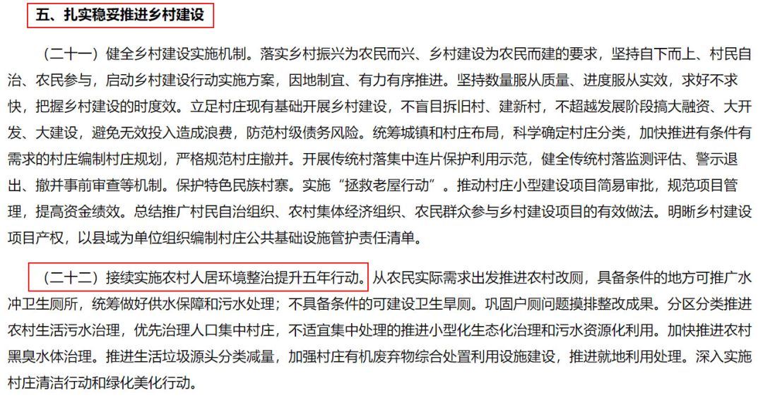 今年的中央一號文件,已經(jīng)是21世紀(jì)以來第19個指導(dǎo)“三農(nóng)”工作的中央一號文件。中央一號文件中,對2022年的“三農(nóng)”工作做出了全面部署,其中包括糧食生產(chǎn)、現(xiàn)代農(nóng)業(yè)、防止規(guī)模性返貧、鄉(xiāng)村產(chǎn)業(yè)、鄉(xiāng)村建設(shè)、鄉(xiāng)村治理、保障機(jī)制,以及黨的領(lǐng)導(dǎo)等8個章節(jié)。這里面,與環(huán)保產(chǎn)業(yè)關(guān)系最密切的就是第5章“扎實(shí)穩(wěn)妥推進(jìn)鄉(xiāng)村建設(shè)”的第二十二節(jié)“接續(xù)實(shí)施農(nóng)村人居環(huán)境整治提升五年行動”。 ·從農(nóng)民實(shí)際需求出發(fā)推進(jìn)農(nóng)村改廁,具備條件的地方可推廣水沖衛(wèi)生廁所,統(tǒng)籌做好供水保障和污水處理;不具備條件的可建設(shè)衛(wèi)生旱廁。