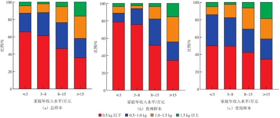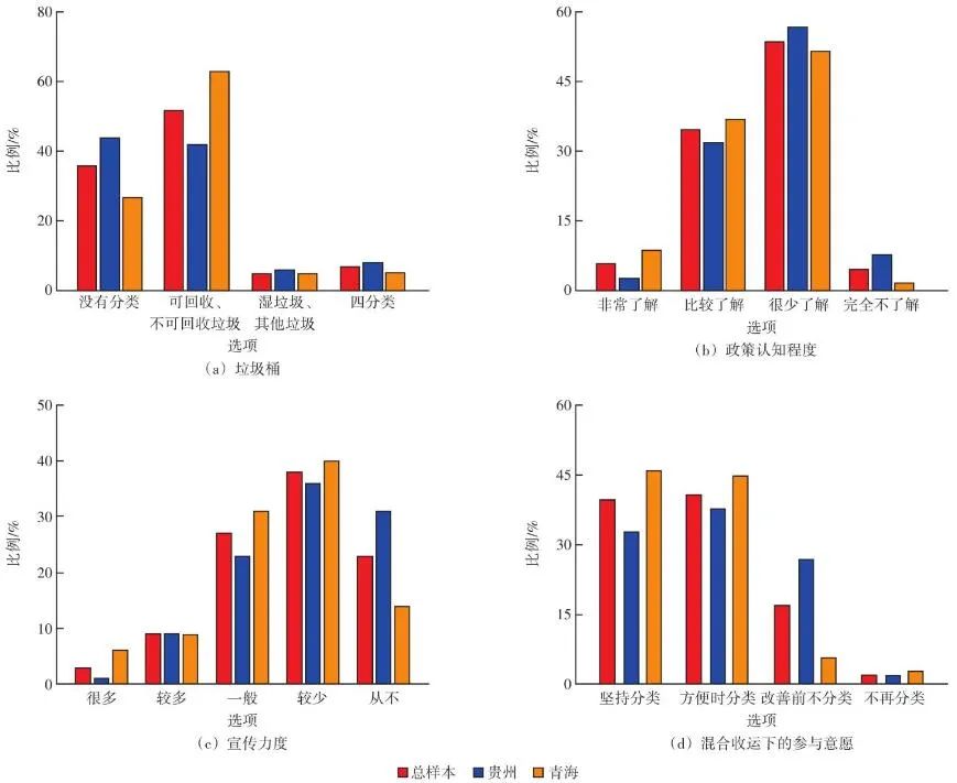 調(diào)查垃圾分類(lèi)政策的宣傳力度,結(jié)果如圖4(c)所示,其設(shè)置“很多”“較多”“一般”“較少”“從不”5個(gè)選項(xiàng),選擇率分別為4%、9%、27%、38%、22%。多數(shù)受訪(fǎng)者認(rèn)為宣傳力度不足,認(rèn)為宣傳“很多”的比例不足一成,“從不”宣傳的比例高達(dá)22%。與青海相比,貴州宣傳力度不足的問(wèn)題更顯著[Sig.(雙側(cè))<0.05],極可能是貴州樣本政策認(rèn)知程度較低的原因。