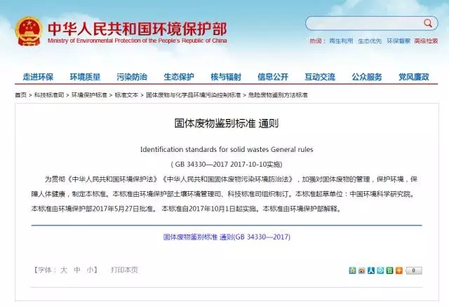 因此,為了統(tǒng)一各個檢驗機構或鑒別機構鑒別固體廢物的尺度,保證鑒別質量和鑒別結果的公正和可靠,環(huán)境保護部與國家質量監(jiān)督檢驗總局聯(lián)合發(fā)布《固體廢物鑒別標準  通則》(GB 34330-2017)。該標準是我國首次制定的關于固體廢物的鑒別標準,具有強制執(zhí)行的效力。