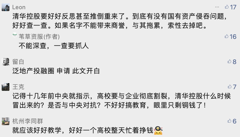 △  文章《 受紫光集團和啟迪控股拖累,清華控股危在旦夕》的讀者留言(可點擊標題查看)。