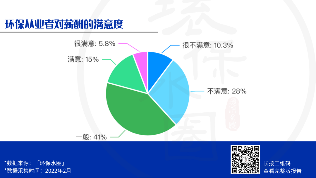 雖然相對(duì)于其他行業(yè),環(huán)保行業(yè)的整體收入偏低,但此次調(diào)研可以看出環(huán)保人對(duì)自己的工作現(xiàn)狀都比較客觀,沒(méi)有抱很大的負(fù)面情緒,約61.7%的從業(yè)者對(duì)當(dāng)前薪資的態(tài)度為一般、滿意。