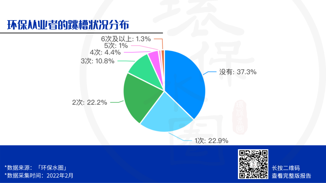 根據(jù)統(tǒng)計(jì)我們可以看到,沒(méi)有過(guò)跳槽經(jīng)歷的環(huán)保人占整個(gè)群體的37.3%;跳槽1-3次的占比過(guò)半,為55.9%;跳槽4次的占比為4.4%;而跳槽5次的占比為1%;跳槽6次及以上的占比1.3%。