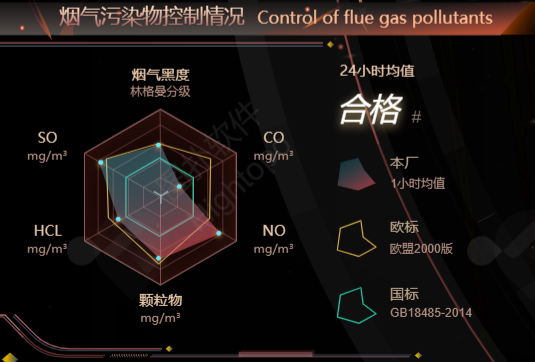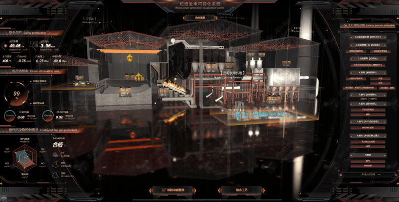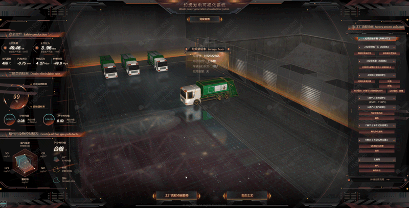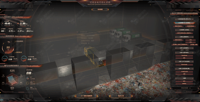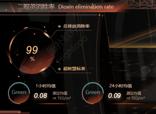 HT 左側(cè)面板循環(huán)播放煙氣污染物控制情況、二噁英消除率、以及安全生產(chǎn)關鍵指標等。