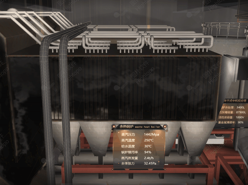 Hightopo 以垃圾焚燒發(fā)電為研究對象,依托自主研發(fā)的 HT for Web 產(chǎn)品,將其設備流程進行可視化演示。將垃圾焚燒發(fā)電站的煙塵排放情況以及處理技術、工藝流程、環(huán)境狀況以及機器故障等仿真模擬。直觀地顯示垃圾焚燒的執(zhí)行進度、設備的運行狀態(tài)、煙氣污染物的控制狀況等,實現(xiàn)垃圾發(fā)電站生產(chǎn)數(shù)據(jù)的可視化管理與應用。