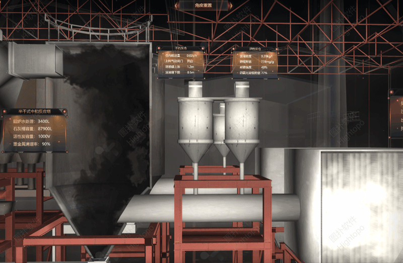 煙氣凈化系統(tǒng)是組合了半干式反應塔、活性炭定量裝置、布袋式除塵器這三個步驟的系統(tǒng)。HT 通過對垃圾在焚燒所產(chǎn)生的煙氣、煙氣處理系統(tǒng)、凈化后通過煙囪排入大氣等過程對煙氣進行虛擬仿真,在場景內(nèi)模擬煙氣凈化過程。煙氣經(jīng)過余熱鍋爐放出熱量后進入噴霧吸收反應塔。