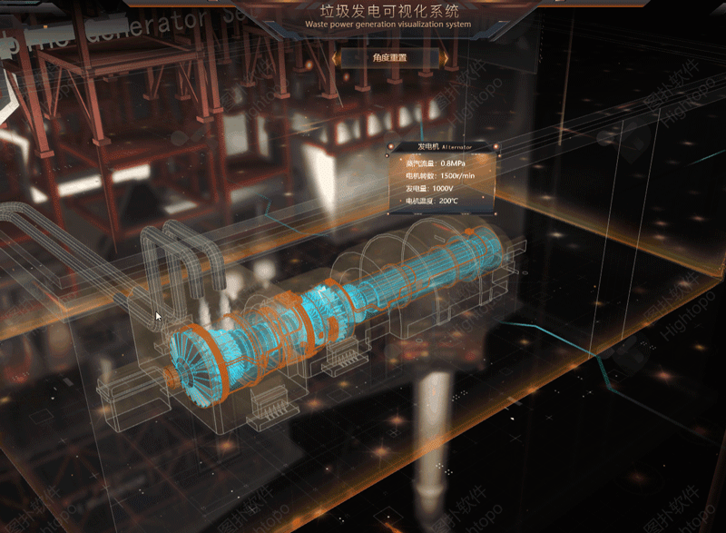 垃圾焚燒系統(tǒng)完全燃燒所產(chǎn)生的熱能經(jīng)余熱鍋爐轉(zhuǎn)化為蒸汽,再由蒸汽輪機發(fā)電機轉(zhuǎn)化為電能,從而完成一系列的能量轉(zhuǎn)換。系統(tǒng)結合 5G 通信系統(tǒng),全方面支持對鍋爐燃燒數(shù)據(jù)可視分析。通過 3D 模型形象呈現(xiàn)發(fā)電機外部結構和工作狀態(tài);蒸汽流量、電機轉(zhuǎn)數(shù)、發(fā)電量、電機溫度等顯示在 2D 面板,自動播放。