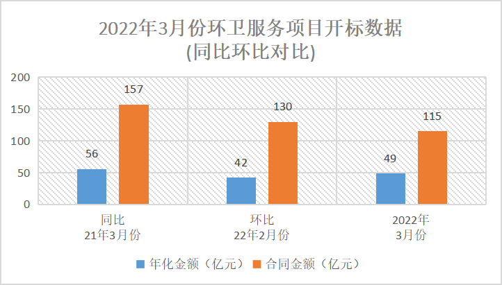受疫情影響,三月份全國(guó)范圍環(huán)衛(wèi)服務(wù)項(xiàng)目大面積暫停招標(biāo)或推遲開標(biāo),與去年同期(同比)及今年二月份(環(huán)比)相比,環(huán)衛(wèi)服務(wù)項(xiàng)目成交年化額及合同額均出現(xiàn)不同程度下降。
