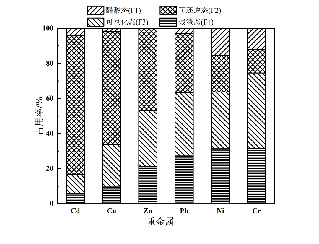 重金屬的生物有效性及潛在遷移性不僅與其總量有關(guān),還與其在飛灰中的賦存形態(tài)密切相關(guān),按照BCR分級(jí)提取法對(duì)焚燒飛灰中不同形態(tài)重金屬進(jìn)行提取測(cè)定。BCR四步連續(xù)提取法將重金屬分為F1態(tài),主要含有水溶態(tài)、可交換態(tài)和碳酸鹽結(jié)合態(tài),在中性或弱酸性條件下易浸出;F2態(tài)主要是鐵錳氧化物結(jié)合態(tài),高活性的鐵錳氧化物比表面積大,對(duì)金屬離子有較大吸附容量,在還原條件下較易釋放;F3態(tài)包括有機(jī)物與硫化物結(jié)合態(tài),這一過程提取出來的重金屬,是被有機(jī)物或硫化物絡(luò)合的部分,在強(qiáng)氧化條件下可分解;F4態(tài)中元素主要與硅酸鹽礦物組合,在自然條件下性能穩(wěn)定,環(huán)境生態(tài)風(fēng)險(xiǎn)較小。本研究飛灰中重金屬的不同賦存形態(tài)所占百分比如圖1所示。