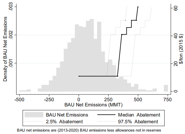 如圖2所示,通過(guò)分析減排需求和減排供給的估計(jì)值,文章發(fā)現(xiàn)市場(chǎng)出清時(shí),溫室氣體交易的價(jià)格有94.8%的概率處于或者接近價(jià)格下限即拍賣(mài)底價(jià)(Auction Reserve Price,ARP)。這意味著相對(duì)于估計(jì)得到的BAU排放量,排放配額的設(shè)定過(guò)高,此時(shí)經(jīng)濟(jì)主體通過(guò)非市場(chǎng)因素的配套政策即可完成溫室氣體減排約束,無(wú)需在交易市場(chǎng)上高價(jià)購(gòu)買(mǎi)排放配額。價(jià)格處于“內(nèi)部均衡”,即均衡價(jià)格高于價(jià)格下限ARP但低于價(jià)格上限(Allowance Price Containment Reserve,APCR)的概率為1.2%,此時(shí)溫室氣體排放的價(jià)格彈性較高,配額交易市場(chǎng)的減排有效性達(dá)到最優(yōu)狀態(tài)。