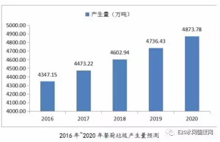 E20研究院的《餐廚垃圾處理市場分析報告(2016)》指出,近年來我國經(jīng)濟快速發(fā)展,餐廚垃圾以每年10%的增量不斷增長。按照城鎮(zhèn)人口每人每天產(chǎn)生0.15kg餐廚垃圾計算,我國2011年的餐廚垃圾產(chǎn)生量為3782萬噸,到2015年我國的餐廚垃圾產(chǎn)生量增長到了4222萬噸。我國餐廚垃圾處理行業(yè)也在2015年迎來了市場的集中爆發(fā)期。預(yù)計2016年我國餐廚垃圾的產(chǎn)生量為4347萬噸,到“十三五”末期,我國的餐廚垃圾產(chǎn)生量將增長至4873萬噸,餐廚垃圾處理形勢嚴峻。