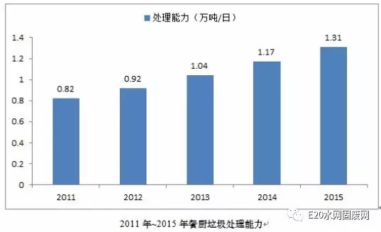 餐廚垃圾處理市場有很大的發(fā)展空間。根據(jù)《“十三五”全國城鎮(zhèn)生活垃圾無害化處理設(shè)施建設(shè)規(guī)劃(征求意見稿)》,“十三五”末期,我國餐廚垃圾日處理能力應(yīng)達到4萬噸/天,處理率達30%左右。而據(jù)E20研究院預(yù)測,到2020年,我國的餐廚垃圾處理能力可達4.52萬噸/天。