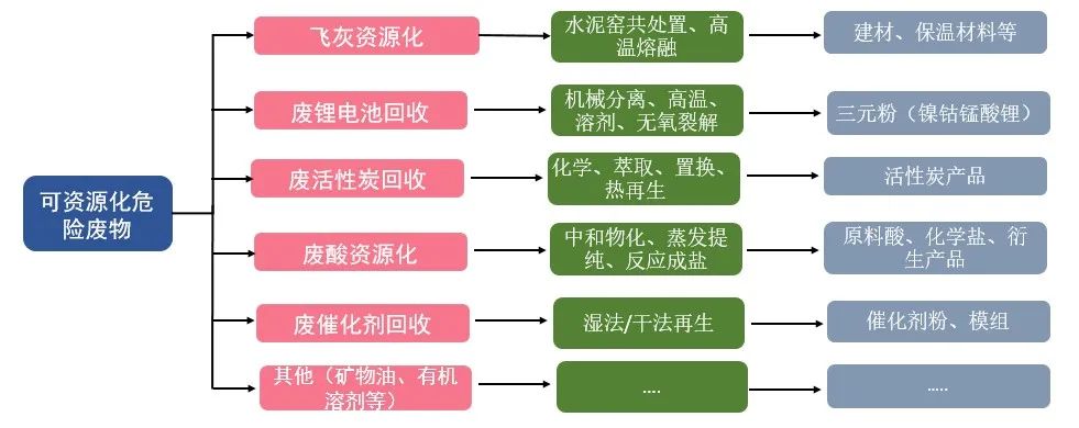 盡管無害化處置取得了長足的發(fā)展,但從長遠(yuǎn)看仍然面臨填埋庫容占用、焚燒二次污染控制難、回收不徹底等問題。針對物性簡單、產(chǎn)生量大、有回收利用價(jià)值的危廢,應(yīng)優(yōu)先考慮資源化利用。綜合分析市場需求及行業(yè)內(nèi)當(dāng)前熱門資源化利用方向,當(dāng)前聚焦較多的資源化利用技術(shù)主要包括焚燒灰渣利用、廢鋰電池回收、廢活性炭再生、廢酸資源化、廢催化劑再生、污泥貴金屬回收、廢有機(jī)溶劑回收等。