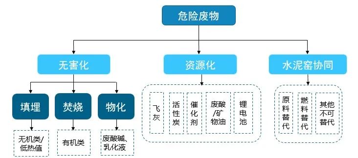 危險(xiǎn)廢物的處理處置技術(shù)主要有資源化利用和無害化處置兩大類。無害化處置技術(shù)主要包括焚燒、物化和填埋三種方式,資源化利用技術(shù)則是將含有有效物質(zhì)等的高價(jià)值危廢,通過提純等方式將危廢加工成資源化產(chǎn)品進(jìn)行出售。此外,水泥窯協(xié)同處置近幾年逐步發(fā)展壯大,也成為無害化和資源化利用的有效補(bǔ)充。從幾種技術(shù)的特點(diǎn)來看,資源化利用技術(shù)是優(yōu)先技術(shù),焚燒處置是適用性最廣的技術(shù),填埋處置則是最終處置方式。