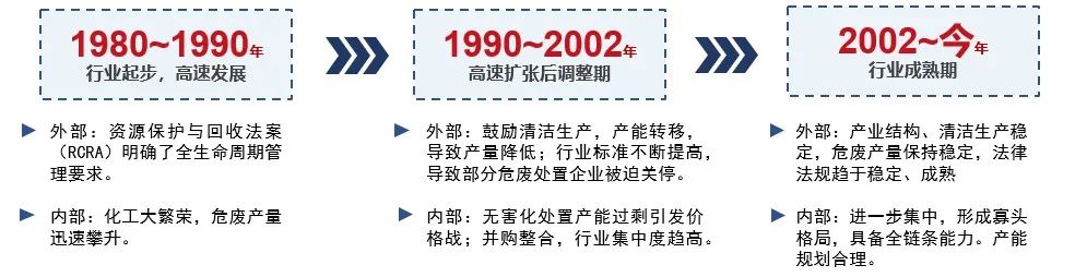 分析發(fā)達(dá)國家的危廢行業(yè)發(fā)展歷程和現(xiàn)狀對我國危廢行業(yè)的發(fā)展有一定的參考和啟示意義。以美國的發(fā)展情況來看,美國的危廢行業(yè)發(fā)展經(jīng)歷了起步后高速發(fā)展、擴(kuò)張后調(diào)整、成熟發(fā)展三個(gè)階段??傮w來說,隨著行業(yè)不斷發(fā)展,一方面外部環(huán)保政策趨嚴(yán),產(chǎn)廢量趨于穩(wěn)定;另一方面內(nèi)部競爭逐漸加劇,產(chǎn)能過剩。進(jìn)而引發(fā)并購整合,使得美國危廢行業(yè)集中度不斷提高,逐漸形成寡頭壟斷格局,頭部企業(yè)開始具備全鏈條服務(wù)能力,產(chǎn)能規(guī)劃也趨于合理。