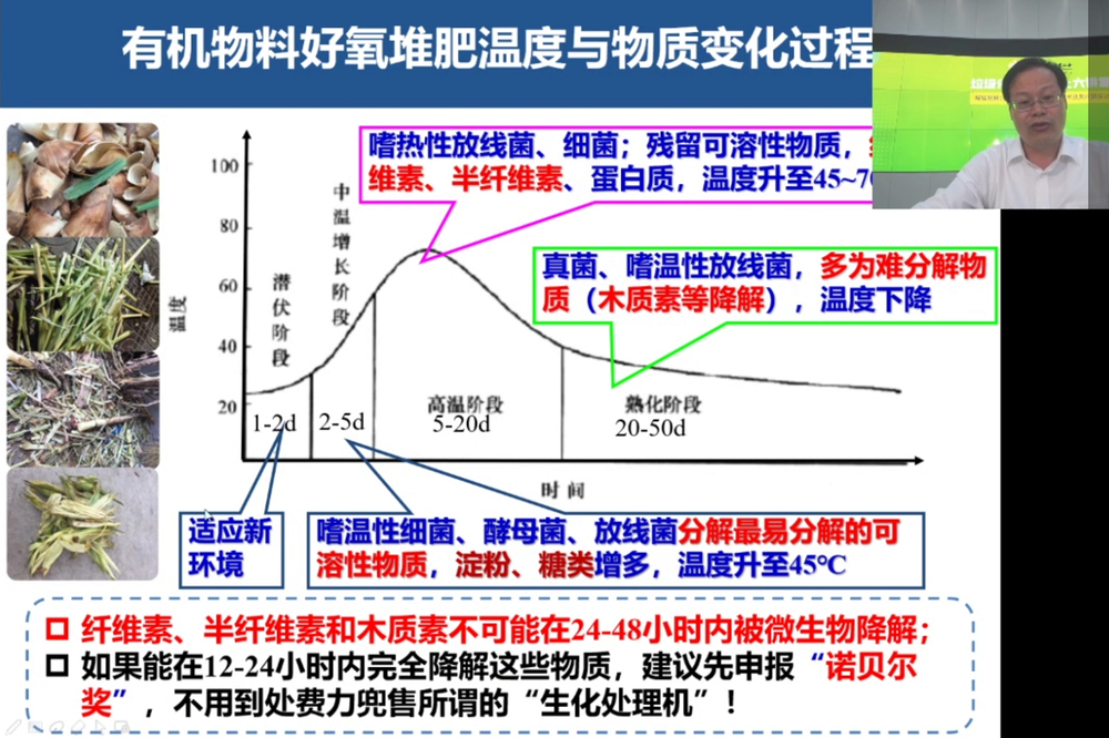 (在一次在線講座中,吳老師提出,如果12-24小時(shí)降解纖維素、半纖維素,木質(zhì)素,建議先申報(bào)諾貝爾獎(jiǎng),不必費(fèi)力兜售“生化處理機(jī)”,圖為講座截圖)