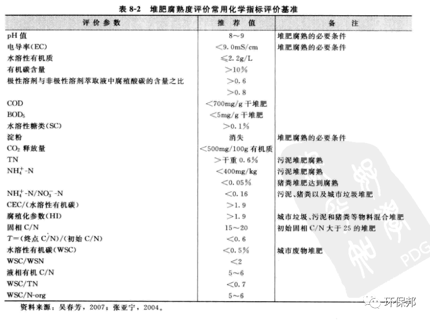 (截圖來(lái)自《堆肥實(shí)用手冊(cè)》)而關(guān)于腐熟度,卻也沒(méi)有一個(gè)標(biāo)準(zhǔn),有很多指標(biāo)可以作為判斷標(biāo)準(zhǔn),這里我就不深究了,可以參考文獻(xiàn)《堆肥腐熟度快速測(cè)定指標(biāo)和方法的建立》(中國(guó)農(nóng)業(yè)大學(xué)碩士論文,2004),該文對(duì)腐熟度問(wèn)題進(jìn)行了比較深入的探討,好幾十個(gè)指標(biāo),當(dāng)然也有其他很多研究者有相關(guān)研究。一般來(lái)說(shuō),可以用腐殖化指數(shù)、種子發(fā)芽指數(shù)等來(lái)作為判別標(biāo)準(zhǔn)。有文獻(xiàn)認(rèn)為,種子發(fā)芽指數(shù)50%可以認(rèn)為基本腐熟,85%以上,可以認(rèn)為就完全腐熟了。所謂的發(fā)酵完成,以產(chǎn)物基本穩(wěn)定(腐熟度)為判斷依據(jù),而量化的話,以種子發(fā)芽指數(shù),還是比較直觀科學(xué)的。