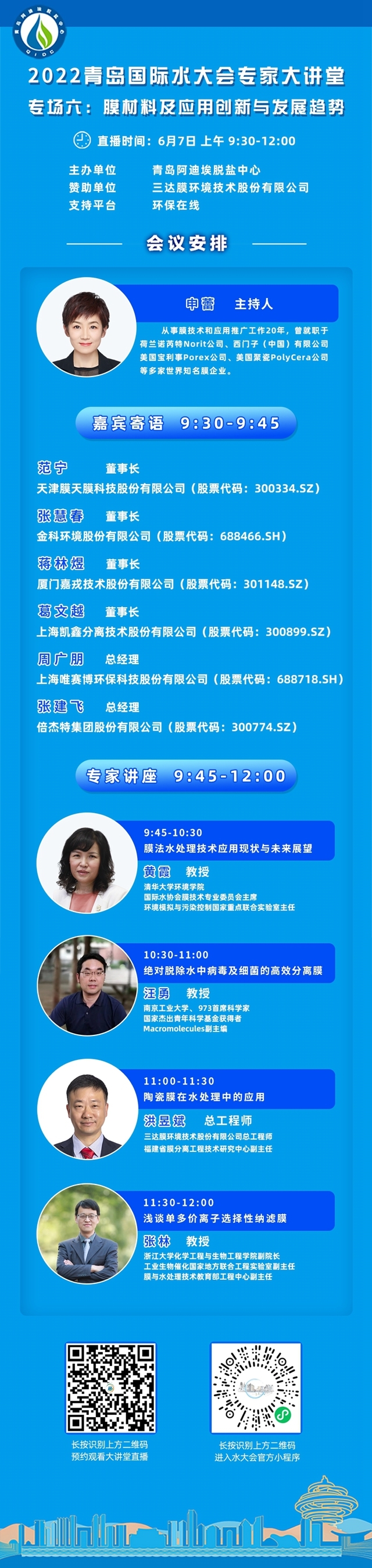 2022青島國際水大會專家大講堂又要來啦~與專家共同探討過海水淡化、水資源化、水生態(tài)修復(fù)等多個主題,6月7日,讓我們再進入專場六:膜材料及應(yīng)用創(chuàng)新與發(fā)展趨勢論壇!