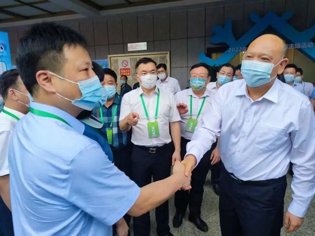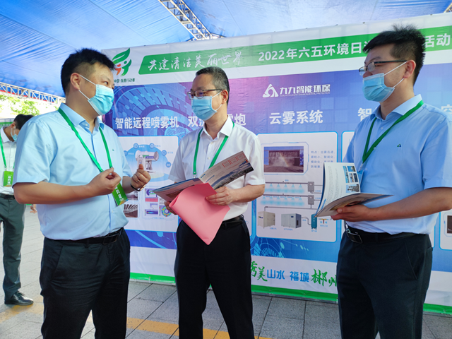 湖南省工信廳二級巡視員吳毅龍在展板前駐足參觀,董事長劉黎明向其介紹了九九智能環(huán)保此次展示的主要核心環(huán)保產(chǎn)品及整體解決方案, 吳毅龍對九九目前開展的環(huán)保項目工作表示贊賞。