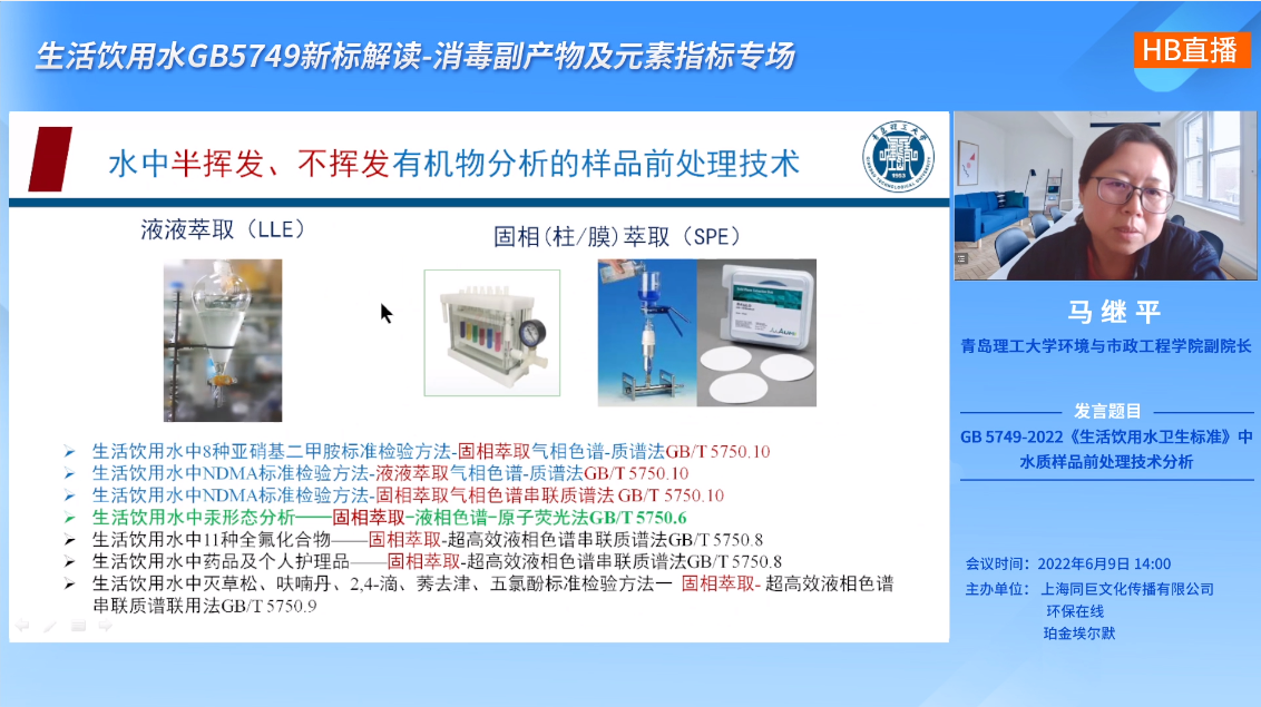 青島理工大學(xué)環(huán)境與市政工程學(xué)院副院長(zhǎng),校分析測(cè)試中心主任馬繼平主要介紹了GB 5749新標(biāo)準(zhǔn)中有關(guān)重金屬和有機(jī)物以及形態(tài)分析方面的水質(zhì)樣品前處理技術(shù),重點(diǎn)介紹了測(cè)定水中消毒副產(chǎn)物等有機(jī)物的樣品前處理技術(shù)。馬主任這場(chǎng)匯報(bào)內(nèi)容詳實(shí)具體、知識(shí)點(diǎn)滿滿,小編提煉重點(diǎn)如下: