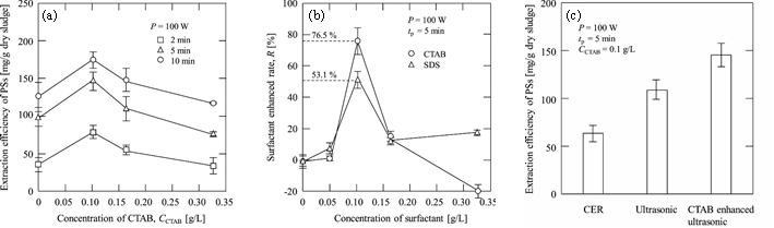 2 不同影響因素的提取效率。(a)不同的脈沖超聲時間下PSs的提取量與CTAB濃度之間的關(guān)系;(b)CTAB和SDS的添加濃度與表面活性劑強(qiáng)化比之間的關(guān)系;(c)三種方法下剩余污泥中高分子物質(zhì)的提取量(來自原文)