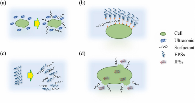 圖3 表面活性劑強(qiáng)化超聲波法提取的四種機(jī)理。(a)降低表面張力;(b)破壞EPSs與細(xì)胞體間的非共價鍵;(c)相似相溶作用;(d)破壞細(xì)胞壁或細(xì)胞膜結(jié)構(gòu)(來自原文)