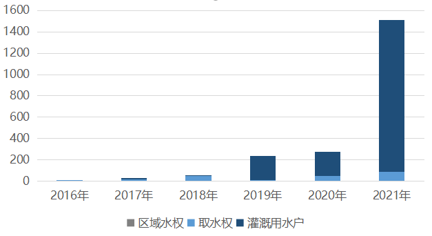 水權(quán)交易包含三種類(lèi)型:區(qū)域水權(quán)、取水權(quán)和灌溉用水戶(hù)交易。其中,區(qū)域水權(quán)交易為政府主導(dǎo),交易主體通常為地方政府或水庫(kù)等,實(shí)現(xiàn)水資源跨區(qū)域調(diào)配,通常規(guī)模最大;取水權(quán)交易為用水主體主導(dǎo),包括企業(yè)等各類(lèi)型對(duì)取水有需求的單位,規(guī)模較大;灌溉用水戶(hù)交易多為農(nóng)戶(hù)向村委會(huì)購(gòu)買(mǎi)水權(quán)或村組之間交易水權(quán),規(guī)模較小。