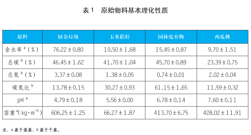 本試驗以分類后廚余垃圾為原料,以粒徑控制在40~50mm以下的玉米秸稈(CS)、園林剪枝(GP)和西瓜秧(WS)按一定比例混合后,作為輔料加入到廚余垃圾中進(jìn)行堆肥。其中廚余垃圾主要含有60.79%菜葉、8.96%剩飯、19.31%果皮、3.68%蛋殼、1.97%骨頭以及5.29%其他物質(zhì)(以濕重計),主要分布在<30mm粒徑段,其次為>80mm和50~60mm的較大粒徑段,其他粒徑段含量較少。堆肥原料的理化性質(zhì)如表1所示。