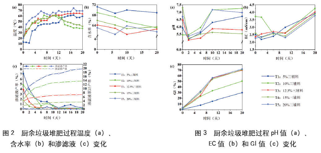 整體看來,各處理含水率呈不斷下降趨勢,而其他各處理含水率均低于5%三輔料處理(圖2b)。到堆肥結(jié)束時,添加12.5%和20%三輔料的處理含水率最低,分別為62.62%和61.54%;5%三輔料處理含水率為68.97%。堆肥開始時,隨著輔料配比的升高,滲濾液產(chǎn)率逐漸降低,5%三輔料和20%三輔料處理差異顯著,初始產(chǎn)率分別為7.2%和0.1%(圖2c)。當(dāng)輔料添加比例由5%增至12.5%時,滲濾液累計產(chǎn)率由19.7%降至7.2%;當(dāng)輔料添加比例增至20%時,滲濾液累計產(chǎn)率為1.0%。由此可見,當(dāng)輔料施用比例大于12.5%時,可以顯著減少由廚余垃圾的高含水率產(chǎn)生的大量滲濾液。
