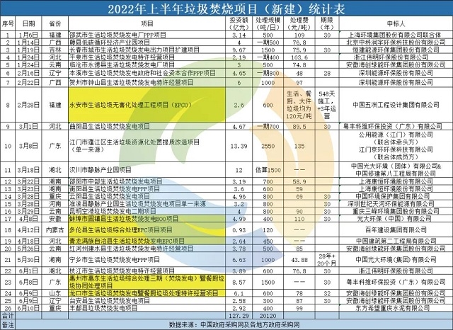 ▼2022年上半年垃圾焚燒項目(新建)統(tǒng)計表(注:標黃為焚燒+協(xié)同處置項目,共計6個)