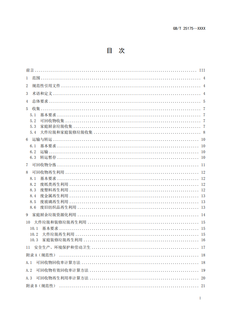 另外標(biāo)準(zhǔn)還對(duì)生活垃圾回收利用過程中的安全生產(chǎn)、環(huán)境保護(hù)和勞動(dòng)衛(wèi)生做出了要求,并在附錄中提供了“可回收物回收率計(jì)算方法”、“可回收物有效回收率計(jì)算方法”、“可回收物再生利用率計(jì)算方法”、“家庭廚余垃圾分出率計(jì)算方法”、 “家庭廚余垃圾資源化利用率計(jì)算方法”。