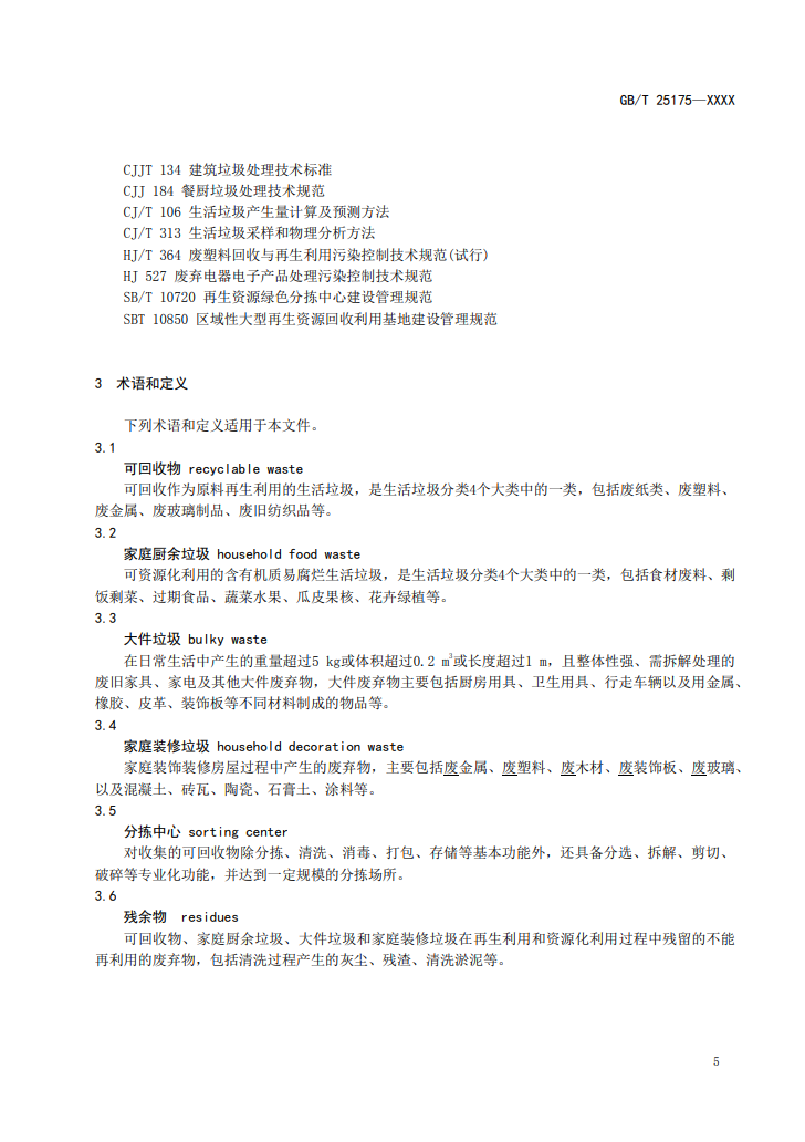 由于標(biāo)準(zhǔn)系由大件垃圾國(guó)標(biāo)修訂而來,因此首先在術(shù)語部分進(jìn)行了修改,對(duì)“可回收物”、“家庭廚余垃圾”、“大件垃圾”、“家庭裝修垃圾”、“分揀中心”和“殘余物”六項(xiàng)做出定義。