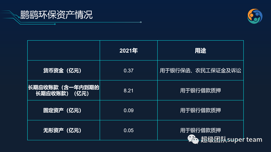 截至2021年底,鵬鷂環(huán)保貨幣現(xiàn)金有4.47億,但短期借款有6.77億,長期借款有7.18億,還有一年內到期的長期借款有1.2億,貨幣現(xiàn)金只能覆蓋短期還款。鵬鷂環(huán)保多個資產(chǎn)科目還存在抵押或質押的情況,受限資產(chǎn)金額約15億,占總資產(chǎn)比例約1/2。