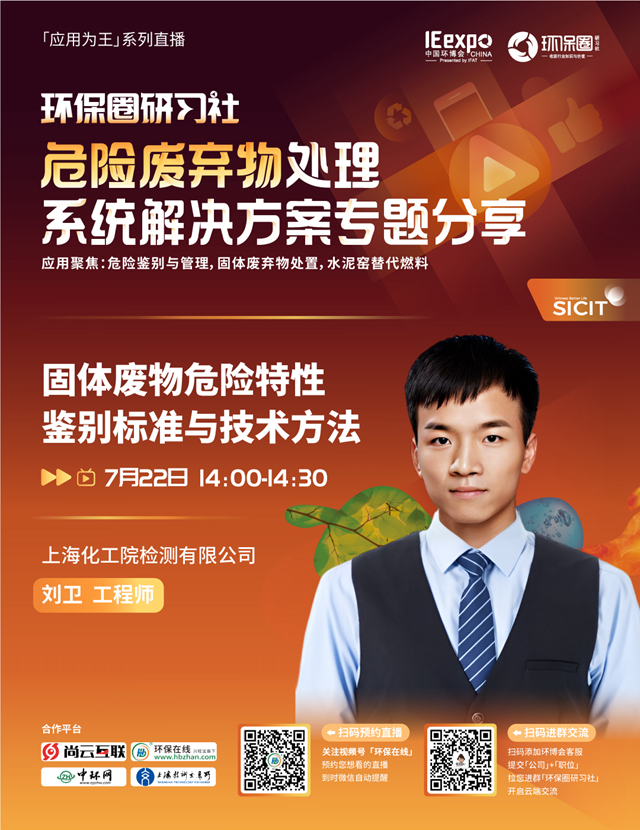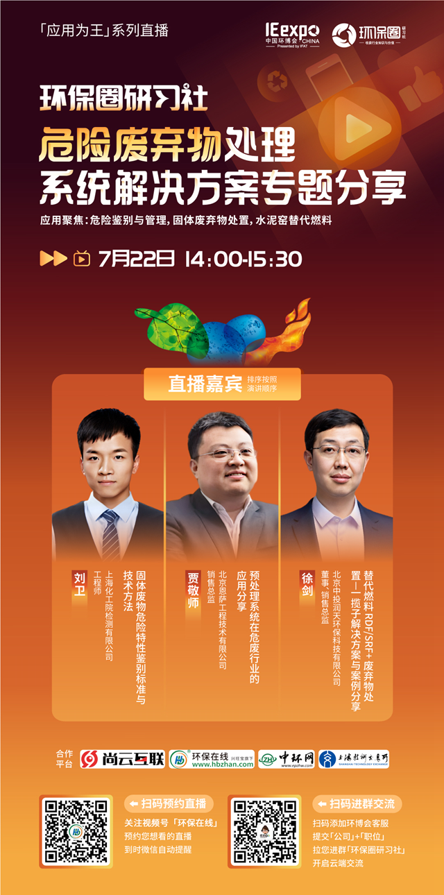 7月22日(星期五)下午14:00-15:30,環(huán)保圈研習(xí)社“應(yīng)用為王”系列直播,危險(xiǎn)廢棄物處理系統(tǒng)解決方案專題分享,我們有幸邀請(qǐng)到了上海化工院、北京恩薩、潤(rùn)天環(huán)保3家企業(yè)的技術(shù)專家做客直播間,與我們共同探討危險(xiǎn)廢棄物的鑒別與管理,危廢焚燒預(yù)處理,水泥窯協(xié)同處置等技術(shù)及相關(guān)解決方案。